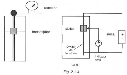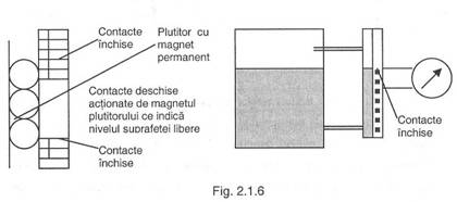 Traductorul de nivel cu plutitor magnetic (fig. 2.1.6). în acest caz emitatorul este montat vertical în tanc si conectat prin cablu la un receptor aflat în alta parte a vasului. Emitatorul se compune dintr-o tija lunga de-a lungul careia se misca un plutitor magnetic o data cu suprafata lichidului. în interiorul corpului ermetic al tijei se afla un divizor de voltaj {o retea -combinatie de multe comutatoare si rezistente), care se întinde pe toata lungimea de indicare a tijei.