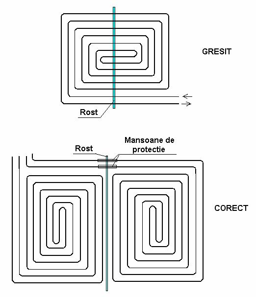 o Nu este permisa executarea de serpentine peste rosturi. Rosturile pot fi traversate numai de tuburile de legatura (tur si retur), iar acestea vor fi protejate in mansoane flexibile care trec cate 30 cm de o parte si de alta a rostului.