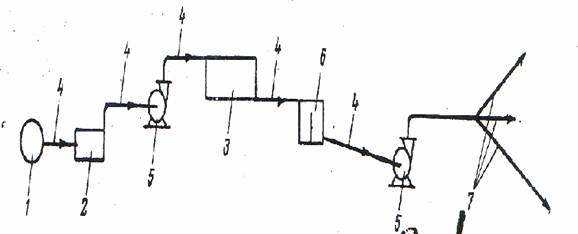 Sursa 1, constructiile si instalatiilede captare 2, instalaiile de tratare a apei 3, aductiunea 4, statiile de pompare 5 si rezervoarele 6 de inmagazinare a apei, care au acelasi rol ca si in cazul scemei de alimentare cu apa potabila ;
