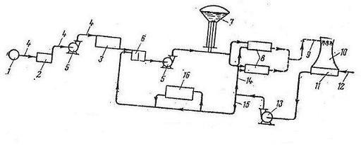 Pompa de circulatie 13 care aspira apa din bazinul 11 si o refuleaza fie direct la agregatele 8 prin conducta 14, fie in rezervorulde inmagazinare 6 prin conducta 15 in care caz apa este in prealabil filtrata parial prin filtru 16 pentru a fi adusa la aceleasi conditii de calitate ca si apa din rezervorul 6.