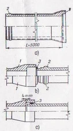 a) forma tubului si a mufei ;b) pozitia initiala a tuburilor care se monteaza ; c) pozitia initiala ; 1.mufa ; 2.prag ; 3 garnitura (inel) din cauciuc.