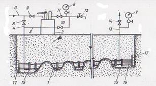 1.conducta ce se probeaza ;2.pompa de mana cu piston ;3.conducta de alimentare cu apa pentru proba ;4.racord pentru cu apa a conductei supusa probarii ;5.conducta de refulare a pompei ;6 si 7.manometre ;8,9,10,11 si 12.robinete ;13.conducta pentru alimentarea aerului ;14.robinet de aerisire ;15.capac (dispozitiv de inventar) pentru inchiderea capetelor conductei ce se probeaza ; 16. elemente de fixare ;17.sprijinire.