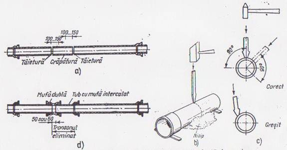 a. trasarea portiunii defecte ;b. taierea tubuluidin fonta de presiune cu dalta in cruce c. pozitiile corecte si gresite in timpul taierii tubului din fonta ;d. tubul din fontaintercalat cu mufa dubla.