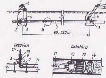 1.tronson de conducta ; 2.vana deschisa ;3.vana inchisa ;4.camin ;5.troliu ;jgliheab ;7. scripete ; 8.suportul scripetelui ; 9. manson ;10.garnitura ;11.cablu ;12.morisca ;13.pere ;