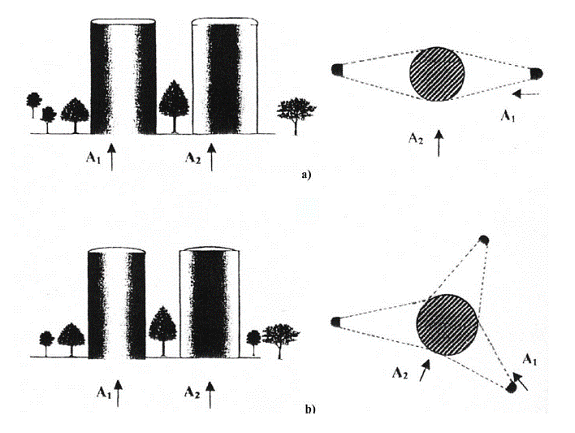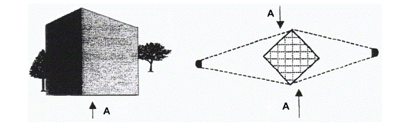 se face în functie de forma obiectivului, respectiv de forma sectiunii orizontale a acestuia. Figura 3 prezinta cazul unei cladiri cu sectiune patratica, care este bine reliefata prin amplasarea proiectoarelor echipate cu puteri diferite de o parte si de alta a cladirii. Directia de privire preferentiala este indicata de sageata A.