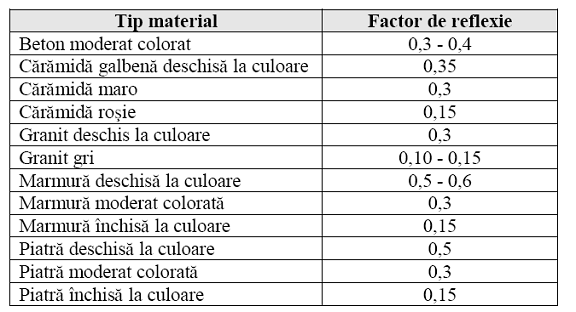 Tabelul 1 Factorii de reflexie în lumina alba ai câtorva materiale de finisaj