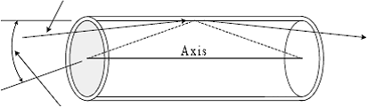 Transmiterea luminii cu pierderi apropiate de zero, in interiorul fibrei optice, apare ca urmare a structurii fibrei, ilustrate in figurile 1 si 2.Inima, avand un factor de reflexie mai ridicat decat izolatia optica, se formeaza un unghi critic fata de axa fibrei sub care toate fasciculele luminoase care intra in inima fibrei sufera o reflexie interna totala. Toate fascicolele care sunt incidente la fata superioara a inimii, sub orice unghi mai mic sau egal decat unghiul critic se vor propaga nedisturbate prin fibra. Unghiul critic defineste un con cu un unghi la varf egal cu de doua ori complementul unghiului critic. Fluxul luminos care patrunde sub un unghi mai mare decat unghiul conului, va fi reflectat total la suprafata despartitoare dintre inima si izolatie(fig. 3)