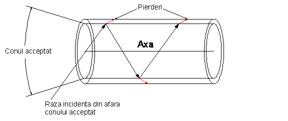 Ceea ce este de retinut este aceea ca nu orice flux incident de lumina pe fibra, se va propaga in interiorul fibrei sau catre capatul acesteia. Sunt cateva lucruri care pot contribui la diminuarea intensitatii luminoase in fibra. In primul rand, daca fluxul nu intra in fibra prin conul acceptat, o parte a acestuia va fi transmis izolatiei si chiar radiat in afara fibrei(fig.3). Chiar daca lumina intra prin conul acceptat in fibra, materialul inimii contine impuritati, care de-a lungul fibrei absorb o parte din flux.
