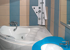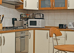 Baia este decorata in nuante de albastru si crem, toate accesoriile din acest spatiu incadrandu-se in paleta coloristica impusa de cele doua tonuri de baza. Bucataria impune un stil ceva mai clasic locuintei, prin designul mobilierului, dar, pe ansamblu, stilul casei este modern-minimalist.
