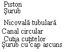 La partea inferioara se afla un canal in forma de cerc cu doua suruburi cu cap ascuns, pentru mentinerea cutitelor la pozitia de deschidere, ca sa nu taie cablul in timpul introducerii. Pistonul cutiei cutitelor este prins de nicovala tubulara, in pozitia de deschidere, cu un surub de cupru 8. Capacul 13 protejeaza cutitele si este prins de cutia cutitelor cu doua suruburi. Pentru a realiza taierea cablului se trece capatul cablului de la toba prin gaura mufei cutitului, dupa care acesta se introduce in sonda cu prajini de pompare sau cu tevi de extractie alunecand pe cablu pana deasupra dispozitivului ramas in sonda. Cu ajutorul unei geale, montate deasupra cutitului se dau cateva lovituri care se transmit ciocanului tubular si nicovalei tubulare. Prin forfecarea surubului de cupru, forta se va transmite mai departe asupra cutitelor. Aceste cutite sunt impinse spre interior si taie cablul. |