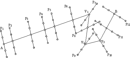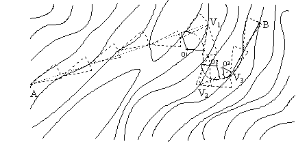 În exemplul din figura 8.32, între punctele A si B, se cere sa se proiecteze un traseu de drum care nu va avea panta mai mare de p%, iar viteza de proiectare cu care vor circula vehicolele pe acest tronson va fi de vkm/h. Pentru rezolvare vom apela la cunostintele din capitolul referitor la probleme rezolvabile pe harti si planuri. De acolo stim sa trasam o linie de panta constanta între punctele A si B, panta ce are valoarea p% ( de obicei mai mica de 7% si în mod exceptional, pentru portiuni scurte, de maxim 10%). Din multitudinea de trasee obtinute am ales varianta figurata cu linii punctate. Se constata ca aceasta varianta prezinta multe inflexiuni, care fac circulatia imposibila. Din acest motiv vom stabili o succesiune de aliniamente, reprezentând tendinta generala a liniei de panta constanta. Vom stabili astfel aliniamentele A-V1, V1-V2, V2-V3, V3-B ce se vor racorda între ele prin arce de cerc cu centrele în O1, O2 si O3. Traseul care rezulta este deci o succesiune de aliniamente si arce de cerc.