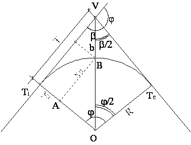 Doua aliniamente concurente în punctul V (figura 8.33) trebuiesc racordate cu un arc de cerc. Datele initiale cunoscute se refera la marimea razei de racordare, R si la masura unghiului între aliniamente, b