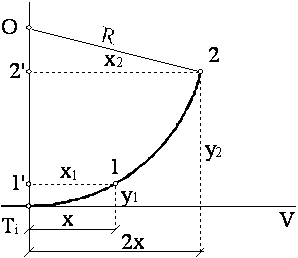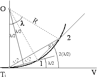 Din relatia [8.65] se obtine valoarea unghiului l . Pentru trasare se va instala un teodolit în punctul Ti care va trasa fata de directia catre V unghiul l/ ; pe aceasta directie, la lungimea s se va meterializa punctul 1. În continuare, teodolitul va trasa fata de acelasi aliniament TiV unghiul 2(l/ . Din punctul 1, deja materializat, se va trasa lungimea s pâna la intersectia cu directia trasata cu teodolitul; se obtine astfel punctul 2.