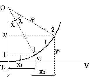 Considerând exemplul din figura 8.36, coordonatele punctelor 1, 2, ..., i se vor calcula pornind de la o valoare aleasa a arcului l care subîntinde unghiul l ce se poate calcula cu relatia:
