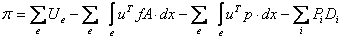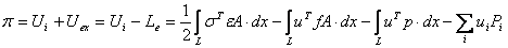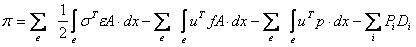 In ultimul termen de mai sus, Pi, reprezinta o forta actionand in punctul i iar ui este deplasarea din punct pe directia x. Sumarea dupa "i" da energia potentiala datorata incarcarilor din toate punctele. Intrucat continutul a fost discretizat in elementele finite, expresia pentru π devine:
