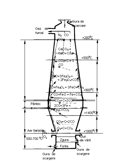 IV - zona de topire (1400-1800)0C, in care fierul carburat se topeste, curge printre straturile de carbune si se aduna in creuzet.