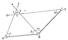 a. se traseaza punctul C prin intersectia unghiulara inainte multipla (trasarea se efectueaza din 3 sau mai multe puncte de sprijin) (figura 4.7), cand pe teren se va obtine un triunghi (poligon) de eroare. Pozitia corecta a punctului C se va gasi in centrul de greutate al acestei figuri geometrice.