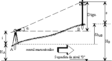 Pentru determinarea diferentei de nivel si a cotei unui punct, se instaleaza un teodolit în punctul A. Instrumentul are înaltimea "i" si vizeaza un semnal instalat în punctul B cu înaltimea "s".
