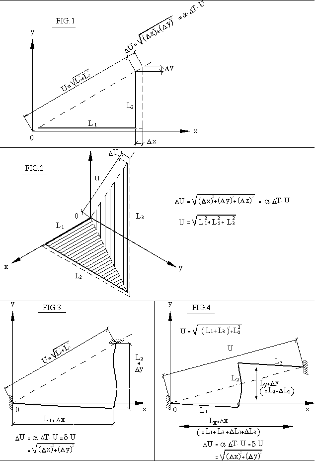 Figurile 1.4 se refera la configuratiile cele mai simple de conducte in plan sau in spatiu, avand numai doua extremitati (puncte fixe sau racorduri de utilaje care nu sufera deplasari), fara alte restrictii intermediare care sa impiedice dilatatiile sau contractiile termice. Cu alte cuvinte: astfel de cazuri se refera la conducte la care nu exista alte deplasari impuse din exterior si nici alte puncte in care dilatatiile sau contractiile termice sa fie impiedicate.