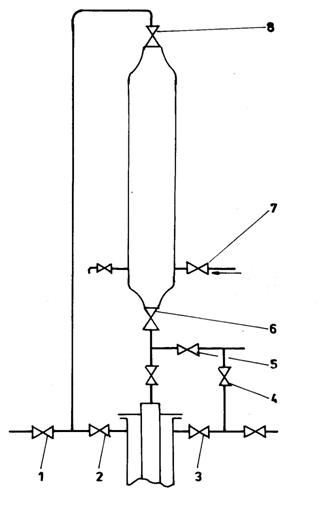 . Se inchide comunicatia cu coloana, se deschide ventilul 1 si ventilul 7 pentru pomparea apei sarate in lubricator. Aceasta elimina titeiul si gazele din lubricator. Se va intrerupe pomparea apei in lubricator, cand aceasta apare la batal prin ventilul 1.