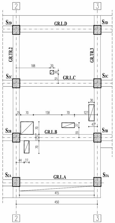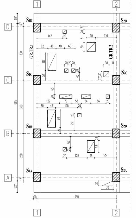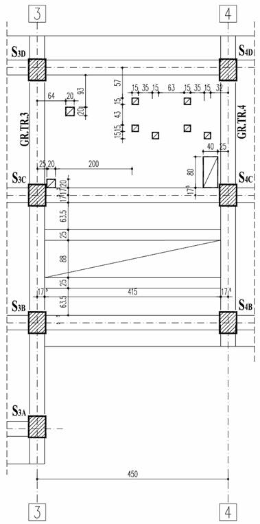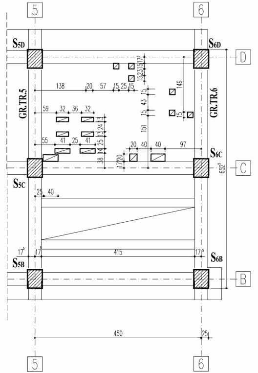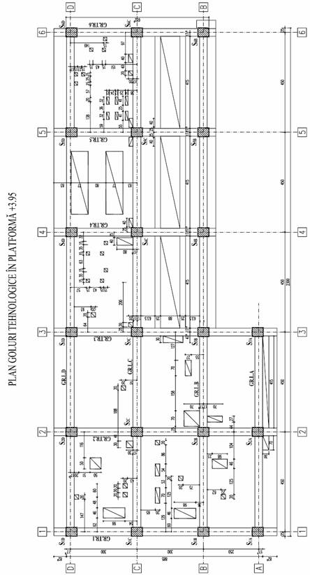 In deschiderea B-C si traveele 3-4, 4-5 si 5-6 sunt amplasate, conform TEMEI DE PROIECTARE, utilajele de macinare. Golurile tehnologice necesare sunt marginite longitudinal de grinzi. planseul, in aceasta zona, este de tip planseu cu placi, grinzi principale si grinzi secundare.