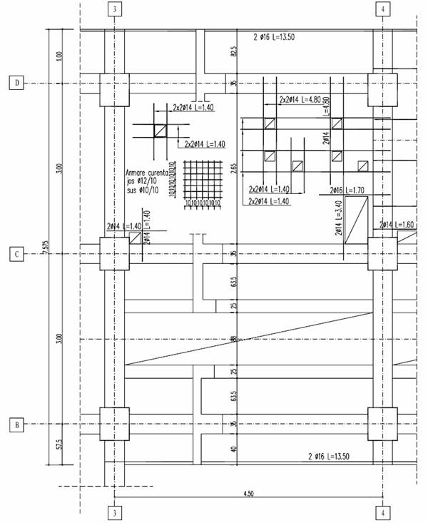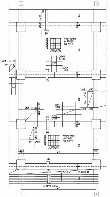 Armarea curenta rezultata din calcul a fost de tip plase din bare independente, dispuse jos si sus: jos Æ12/10 cm PC 52, sus Æ10/10 cm PC 52.