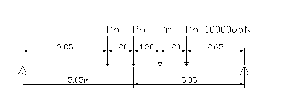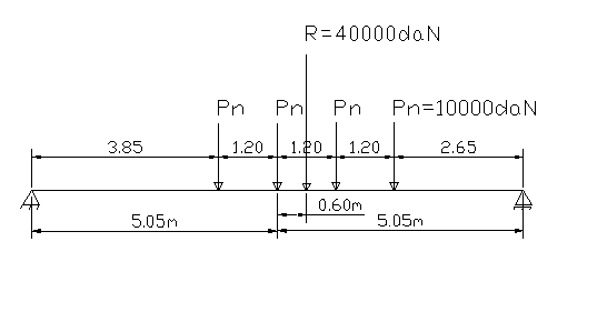 In acest caz se deplaseaza convoiul pe pod in sensul inegalitatii si se reface calculul. Pentru ca se face calculul in sectiunea centrala se ajunge in situatia de simetrie cu acelasi rezultat ca in pozitia anterioara, rezulta ca prima pozitie este pozitia de moment maxim pentru care se calculeaza Mmax cu relatia: