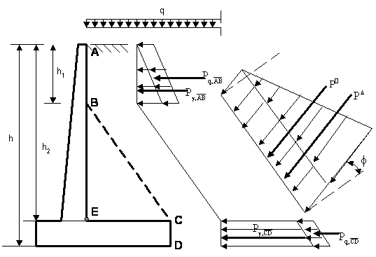 - planul de rupere este vertical, prismul de pamânt ce reazema direct pe talpa zidului deplasându-se solidar cu zidul;