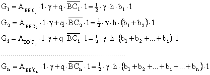 Se calculeaza apoi greutatile prismelor astfel obtinute, tinându-se seama si de prezenta suprasarcinii q, daca este cazul:
