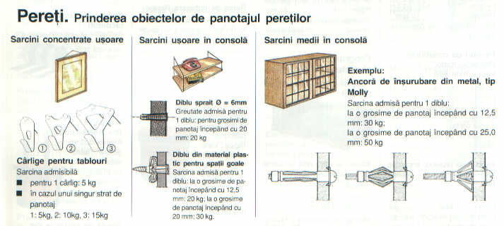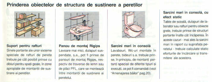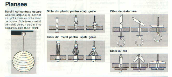 Extras din norma austriaca B3415 "Reguli pentru prelucrarea panourilor de gips-carton" 5.4.2. Prinderi de plansee la rosu. Pentru fiecare element in parte sunt valabile urmatoarele: - la dibluri si suruburi: siguranta trebuie sa fie >= 3; trebuie prevazut un punct de prindere pentru 1 mp. - la cuie (solicitate): in principiu greutatea plafonului nu trebuie sa depaseasca 20 kg/mp; pentru fiecare punct de prindere, trebuie batute 2 cuie inclinate unul spre celalalt ("in cruce"); trebuie prevazute minimum 3 puncte de prindere pentru 1 mp. - la bolturi: siguranta trebuie sa fie = 5; trebuie prevazute minimum 2 puncte de prindere pentru 1 mp, capacitatea portanta a elementului de prindere (dibluri, etc) de elementul portant (planseu la rosu) trebuie verificata pentru cel putin 5 din locurile de prindere; la aceasta verificare nu trebuie sa fie inregistrate jocuri; daca se inregistreaza jocuri, trebuie verificate alte 10% din locurile de prindere; rezultatele testarilor trebuie trecute in jurnalul de santier. Daca de plafoanele suspendate se prind sarcini suplimentare (accesorii incastrate sau suspendate), trebuie respectate urmatoarele prevederi: sarcini suplimentare <= 3 kg pot fi prinse direct de panouri, daca acestea au grosimea de minimum 12 cm, iar distanta dintre punctele suprasolicitate este de minimum 50 de cm. Sarcini suplimentare >3 kg/mp si <= 20 kg/mp trebuie prinse direct de structura de sustinere, fiecare punct de prindere putand fi solicitat de maximum 10 kg. Sarcini suplimentare de suprafata de peste de peste 20 kg/mp trebuie prinse direct de planseul la rosu. (Extrasul s-a realizat prin bunavointa Institutului Austriac de Normare).