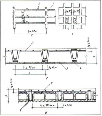 a - cu nervuri dupa o directie; b - cu nervuri dupa doua directii(plansee chesonate);c - realizarea tavanului plan cu tenticula pe sipci; d - realizarea tavanului cu ajutorul corpurilor de umplutura; 1 - nervure transversala; 2 - nervuri longitudinale; 3 - armature de rezistenta in placa; 4 - sipci; 5 - tenticula de sipci si trestie; 6 - corpuri de umplutura cu goluri din beton usor; 7 - armature de rezistenta din nervuri(obisnuit una sau doua bare cu diametrul de 10mm)