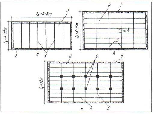 a - cu grinzi dispuse dupa o singura directie; b - cu grinzi principale si grinzi secundare, fara reazeme intermediare, c - cu reazeme intermediare;1 - nervuri; 2 - perete; 3 - palca; 4 - grinzi secundare; 5 - grinzi principale; 6 - stalpi.