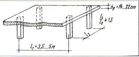 Planseele dala sunt alcatuite din placi de beton armat monolit de 14 - 22 cm grosime care reazema direct pe stalpi.