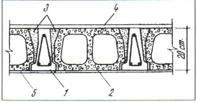1 - grinda prefabricate din beton armat;2 - corp de umplutura prefabricate;3 - beton de legatura;4 - pardoseala;5 - tencuiala