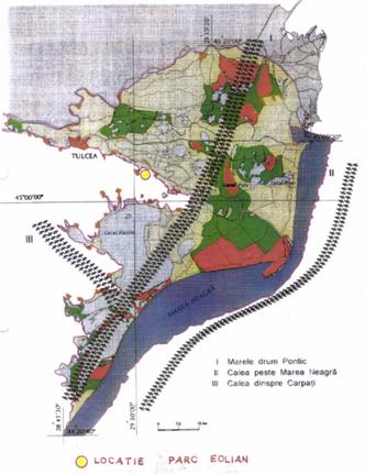 Examinand amplasamentul parcului eolian comparativ cu rutele de migrare ale pasarilor constatam ca zona studiata se situeaza la circa 20 km de Marele Drum Pontic si la peste 45 km de Calea dinspre Carpati.