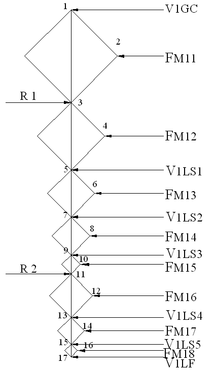 Se considera ca lonjeronii secundari sunt rezemati pe montantii de capat si se noteaza punctele in care sunt aplicate fortele rezultate ca reactiuni din actiunea grinzilor orizontale.