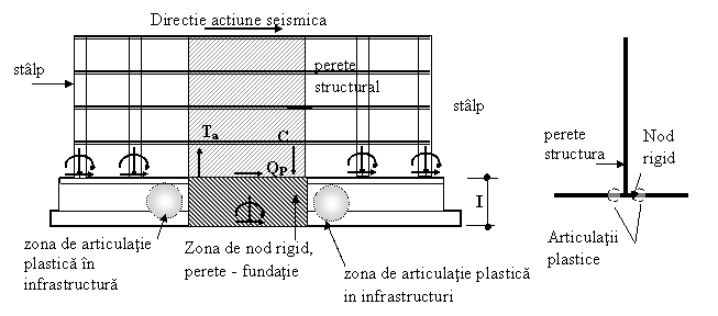 Prin calibrarea rezistentei elementelor sistemului structural (suprastructura si infrastructura) se realizeaza dirijarea mecanismului de plastificare in cazul actiunilor seismice intense. De regula, deformatiile plastice sunt dirijate in suprastructura iar infrastructura este proiectata sa raspunda in domeniul elastic de comportare (fig. 3).