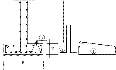 ●Armatura transversala (1) rezulta din verificarea consolei talpii la moment incovoietor in sectiunea de la marginea peretelui. In unele cazuri, in care peretele este excentric pe talpa fundatiei, armaturile (1) pot rezulta si din verificarea fundatiei la momente de torsiune.