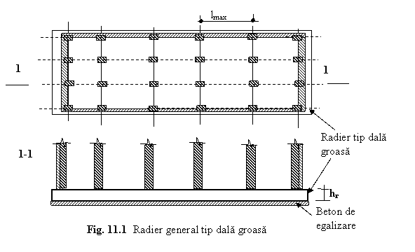 c) radier tip placa si grinzi (drepte sau intoarse) dispuse pe una sau doua directii (fig. 11.4); se recomanda alegerea inaltimii grinzii (hg) si a placii radierului (hr) conform relatiilor: