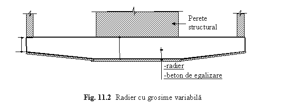 radier cu grosime variabila (fig. 11.2); solutia poate fi adoptata in cazul unei constructii cu pereti structurali din beton armat care transfera eforturi sectionale importante intr-o zona centrala a acestuia