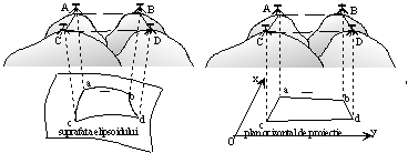 Prin proiectia geodezica a punctelor de triangulatie A, B, C, D pe suprafata elipsoidului, în punctele a, b, c, d se obtin triunghiuri cu laturi curbe, laturi care se numesc si linii geodezice. Se poate observa (figura 1.3) ca în acest caz proiectantele punctelor de triangulatie sunt convergente catre o zona din centrul globului pamântesc. Daca suprafata pe elipsoid este mica (cazul punctelor apropiate), putem asimila elipsoidul cu o suprafata plana fara ca precizia coordonatelor si pozitia punctelor sa sufere.