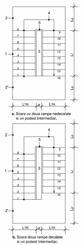 scara cu doua rampe drepte nedecalate si un podest intermediar, fig.5.5.5.a.