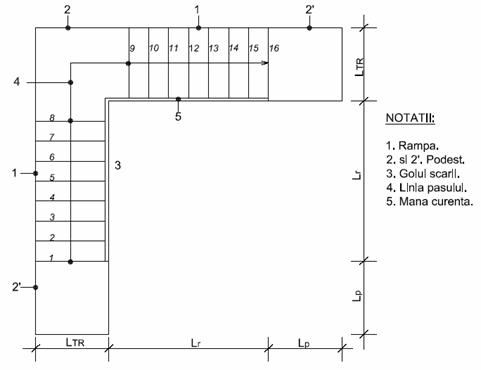 În fig. 5.5.6. este expusa o solutie de scara cu doua rampe dispuse perpendicular si podest intermediar. Aceasta varianta este folosita în cazuri deosebite, când spatiul casei scarii permite desfasurarea scarii.
