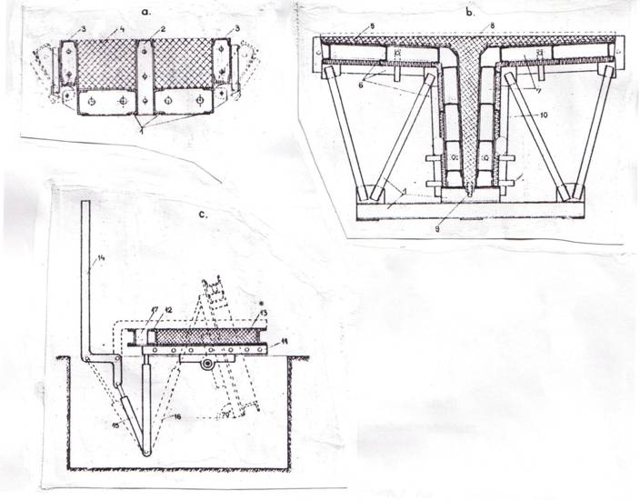 1 - suportul tiparului; 2 - perete despartitor fix; 3,12 - perete rabatabil; 4,8,13 - element prefabricat; 5 - placa cofranta; 6 - nervure rigidizare pereti laterali; 7 - spatiu circulatie agent incalzitor; 9 - dispozitiv de decofrare; 10 - izolatie termica; 11 - platforma fixa/rabatabila; 14 - panou incalzitor; 15 - sistem deplasare panou incalzitor; 16 - sistem hidraulic de cofrare; 17 - cric hidraulic de cofrare