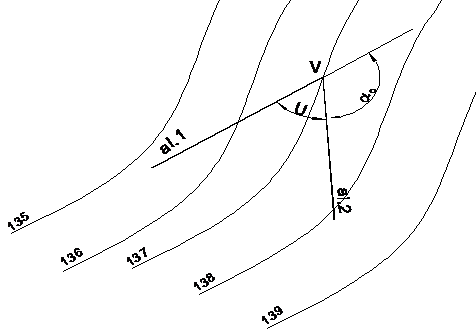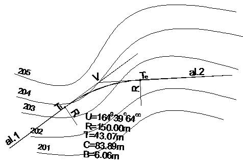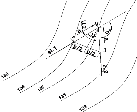 Unghiul la varf este unghiul interior pe care il fac cele doua aliniamente succesive ce urmeaza sa fie racordate. Valoarea unghiului la varf se stabileste prin metoda grafo-analitica, in felul urmator: