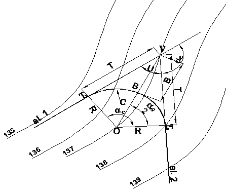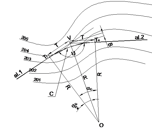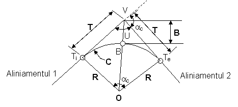 Curbele folosite pentru racordarea aliniamentelor traseului se definesc prin elementele lor caracteristice. Elementele pricipale care definesc curbele arc de cerc sunt urmatoarele (figura 1.4):