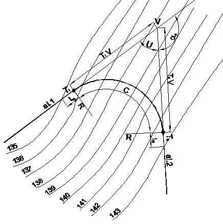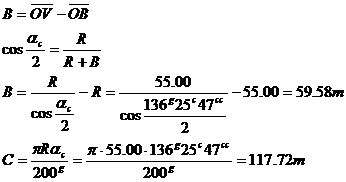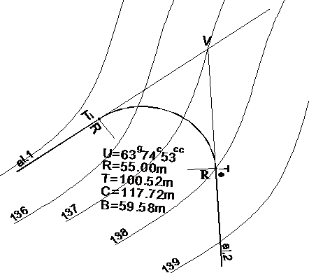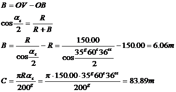 - raza cercului este 90.00 m, unghiul la varf U = 63g78c88cc si lungimea cercului este C = 193.00 m (figura 1.27).