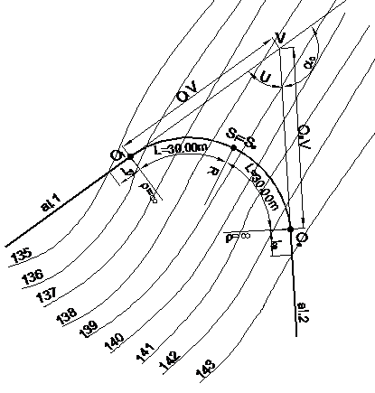 - racordarea celor doua aliniamente este realizata cu doua arce de curba progresiva dispuse simetric, de lungime L = 30.00 m.