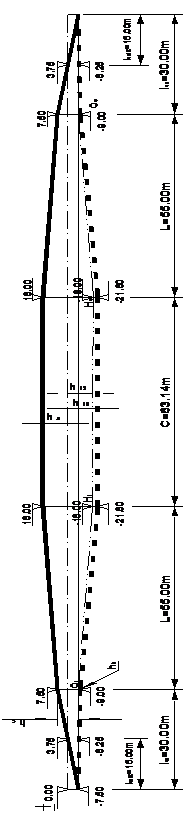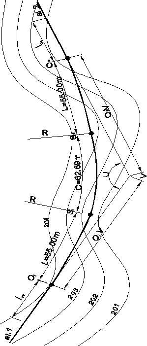 - racordarea celor doua aliniamente este realizata cu doua arce de clotoida dispuse simetric, de lungime L = 55.00 m si un arc de cerc cu raza R = 140.00 m (figura 1.22).