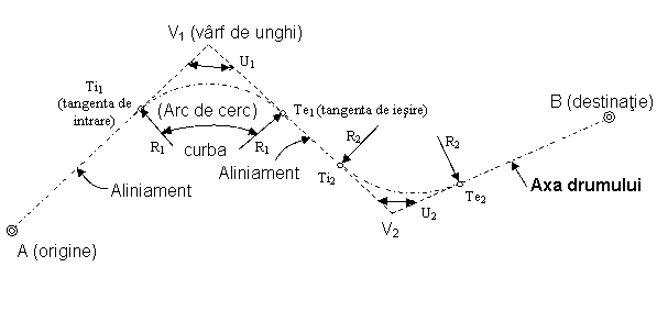 Traseul drumului reprezinta o succesiune de aliniamente portiuni rectilinii - racordate intre ele prin curbe (arc de cerc, arce de curba progresiva sau combinatii ale acestora) portiuni curbilinii (figura 1.1), ale caror elemente geometrice trebuie cunoscute.